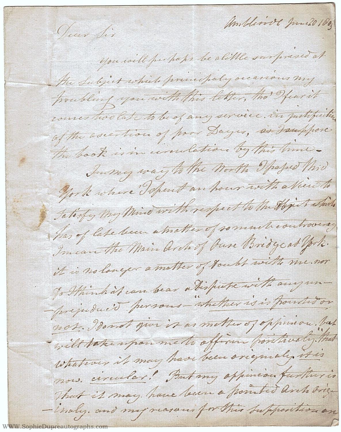 Autograph Letter Signed to Edward Wedlake Brayley, 1773-1854, the topographer (George, 1763-1841, Landscape Painter)