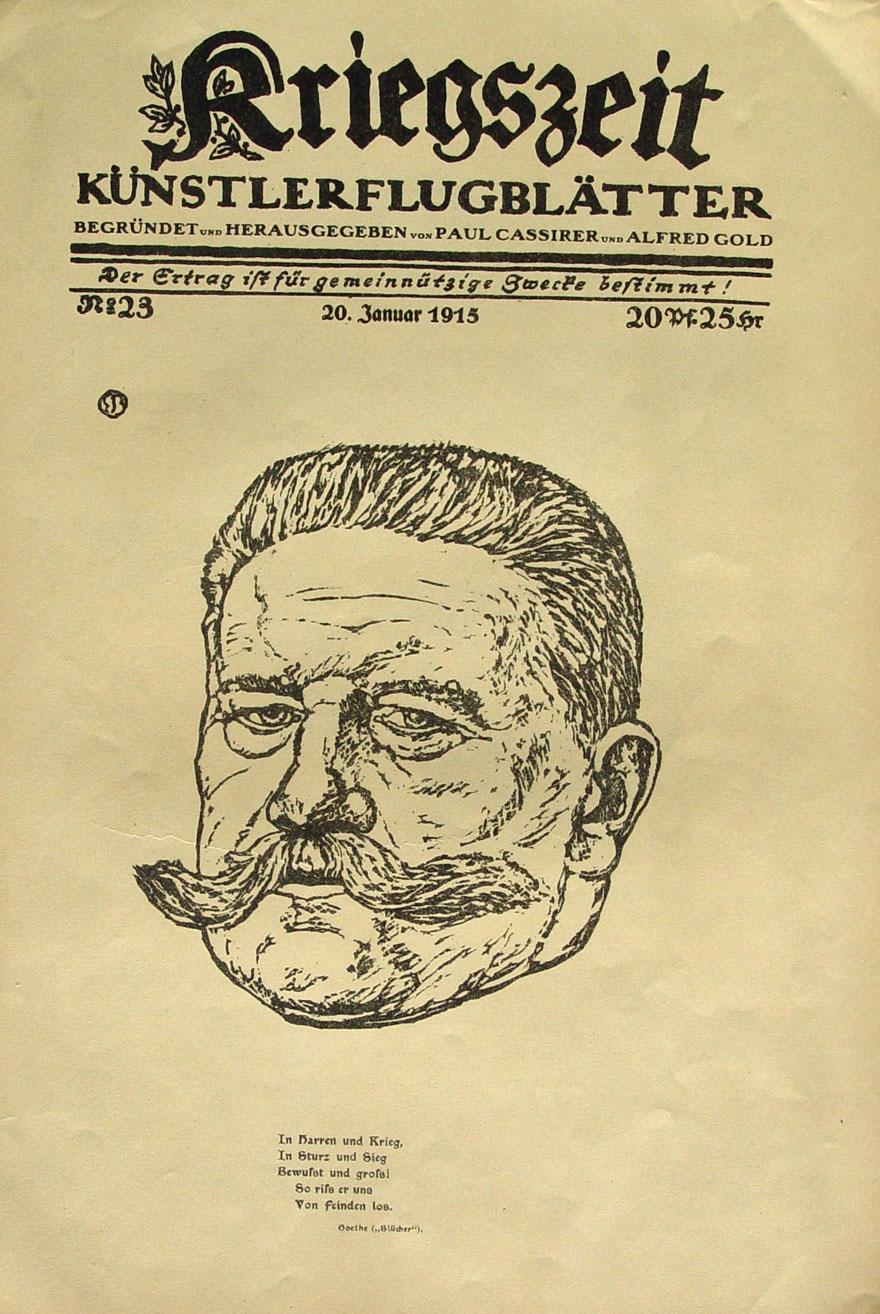 "In Harren und Krieg, In Sturz und Sieg…" (Porträt Paul von Hindenburg) originale Lithographie auf bräunlichem Velin ca.45x30cm; im Stein monogrammiert und betitelt; Titelblatt der "Kriegszeit" Nr. 40 vom 20. Januar 1915; Paul Cassirer Berlin"