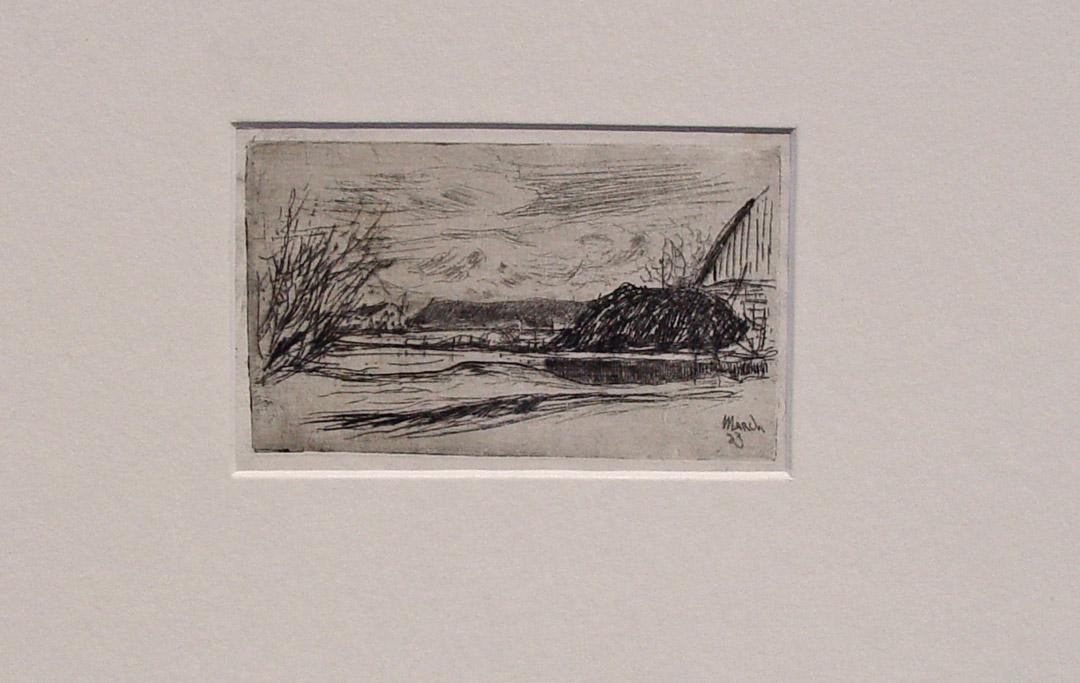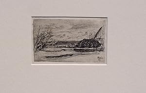 "Hofstätte eines Bauernhauses" originale Radierung über Tonplatte ca. 8x13,5cm (Darstellung/Image size) auf Japan (ca.10x15,5m) in der Platte datiert "March (18)83"